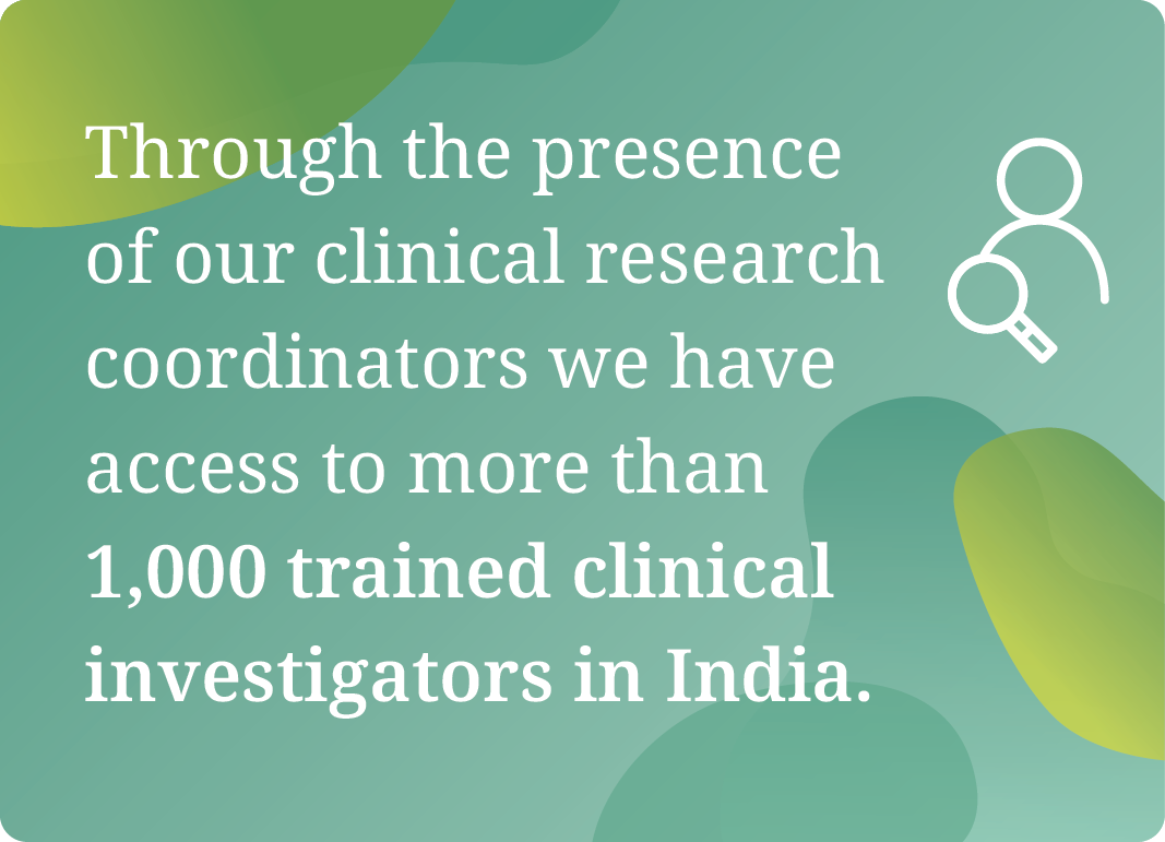 With more than 90 sites in India, the Avacare site network supports clinical development through the placement of highly trained clinical research coordinators at each research site dedicated to a specific protocol. Our research coordinators ensure each trial is conducted with the highest standards of quality, ethics and performance, offering a 95% patient retention rate.
