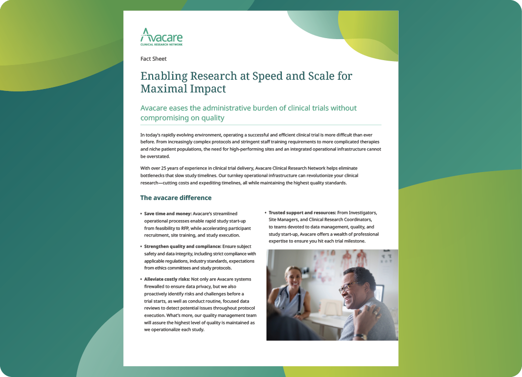The Avacare team expertly supports site operational needs through a proven, turnkey research infrastructure giving clinical staff the freedom to focus on patient care delivery.